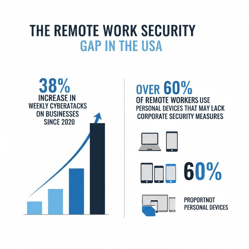 Remote work in the United States brings flexibility, but it also increases digital security risks. With employees connecting from home, cafés, and co-working spaces, cybercriminals have more opportunities to attack. Reports indicate a sharp rise in weekly cyberattacks since before the pandemic, often aimed at remote workers. Public Wi‑Fi, in particular, exposes company data, logins, and personal information to interception.
